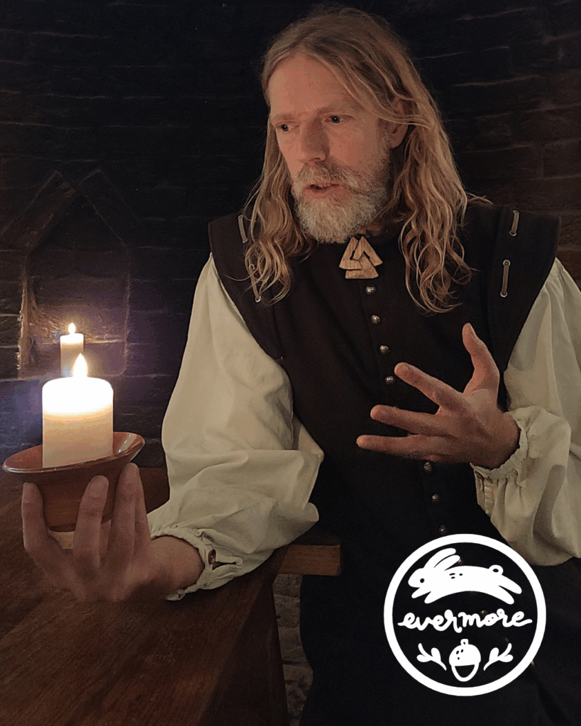 tap in een wereld van Vikingen, mythen, en volksverhalen tijdens de show van Bart the Bard; verhalenverteller en muzikant. In ware Skaldische traditie verweeft Bart zijn krachtige folk liederen met eeuwenoude legenden. Hij neemt je mee van de saga’s van Viking helden tot betoverende werelden waar de Fae hun spreuken fluisteren. Zowel op het podium als rond het vuur worden zijn luisteraars meegevoerd naar een andere tijd en plek. Speciaal voor Evermore heeft hij een verhaal gesponnen rondom de grafheuvel en de legendarische bloedsteen op Landgoed Kernhem. Dit wil je niet missen!